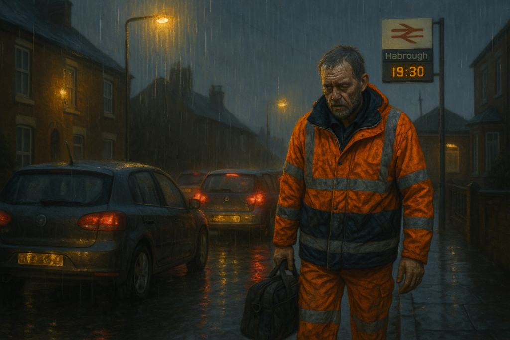 So, once again, I trundled off to the station car park—three-quarters full, naturally—and wedged the van into the only spot that didn’t require a six-point turn. Passed the Missus’s car languishing in the pub car park, still sitting there like a hostage. The pub folk will surely kick off tomorrow. I’m tempted to leave a note on the dash reading “We live here, honest.” Doubt it will help.